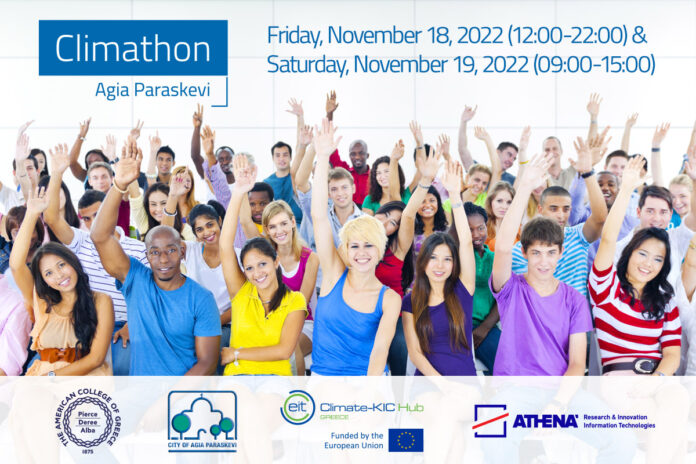 Ένας 24ωρος μαραθώνιος ιδεών για το κλίμα, το Climathon, έρχεται στις 18 και 19 Νοεμβρίου 2022 στην Αγία Παρασκευή από το Αμερικανικό Κολλέγιο Ελλάδος, τον Δήμο Αγίας Παρασκευής και το Ερευνητικό Κέντρο «Αθηνά» -το οποίο διευθύνει το EIT Climate-KIC Hub Greece- και σε συνεργασία με το Κέντρο Αριστείας για τη Βιωσιμότητα, καθώς και το γραφείο Δημοσίων Υποθέσεων του Αμερικανικού Κολλεγίου Ελλάδος.