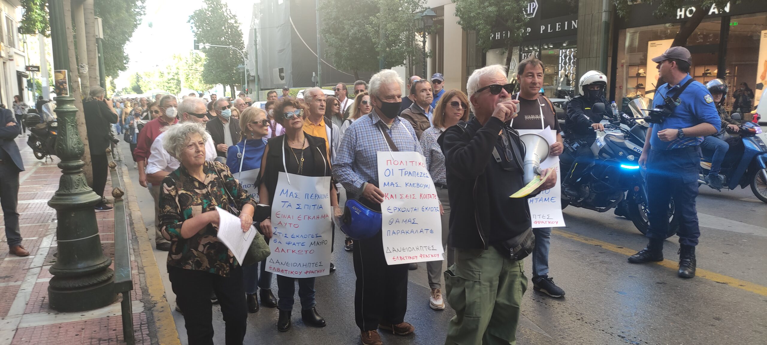 Οι δανειολήπτες το περασμένο Σάββατο πραγματοποίησαν συγκέντρωση διαμαρτυρίας στην Πλατεία Κλαυθμώνος και στη συνέχεια έκαναν πορεία προς το υπουργείο Οικονομικών και στη Βουλή.