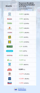 Αναλυτικά, οι ποσοστιαίες μεταβολές στο «καλάθι του νοικοκυριού» κάθε αλυσίδας στο επισυναπτόμενο γράφημα και αναλυτικά οι τιμές των προϊόντων στο ακόλουθο link: