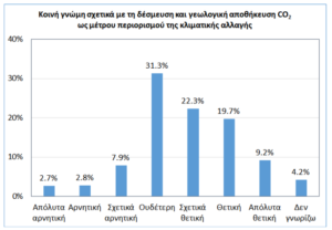 - Από την άλλη, οι πολίτες έχουν περιορισμένη ενημέρωση και γνώση για τη δέσμευση και γεωλογική αποθήκευση του CO2, ενώ έχουν -κυρίως- θετική ή ουδέτερη αντίληψη για τη χρήση της ως εργαλείου μετριασμού της κλιματικής αλλαγής.