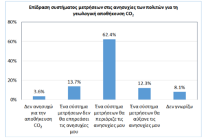 - Μικρό ποσοστό του ελληνικού πληθυσμού έχει αρνητική άποψη για τη γεωλογική αποθήκευση CO2. Ωστόσο, οι χώροι γεωλογικής αποθήκευσης CO2 γίνονται αντιληπτοί ως δυνητικός κίνδυνος για το περιβάλλον και οι πολίτες θα ανησυχούσαν για την παρουσία ενός πεδίου γεωλογικής αποθήκευσης CO2 στη γειτονιά τους ή ακόμα και υπεράκτια, κάτω από τον πυθμένα της θάλασσας.