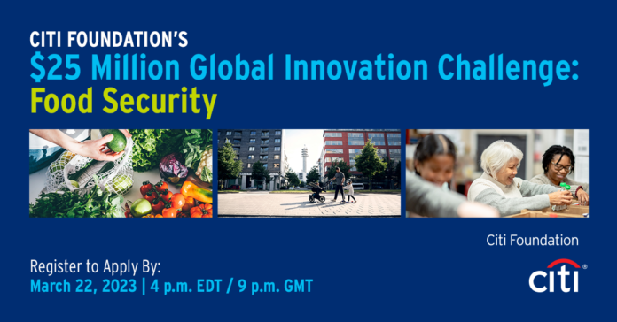 Το Ίδρυμα Citi ανακοίνωσε σήμερα την πρώτη του Παγκόσμια Πρόκληση Καινοτομίας για να βοηθήσει στην κλιμάκωση του αντίκτυπου των μη κερδοσκοπικών οργανισμών σε όλο τον κόσμο που αναπτύσσουν καινοτόμες λύσεις για τη βελτίωση της επισιτιστικής ασφάλειας. Συνολικά, το Ίδρυμα Citi προσφέρει 25 εκατομμύρια δολάρια σε 50 οργανισμούς παγκοσμίως για την υποστήριξη πιλοτικών έργων που έχουν σχεδιαστεί για την αντιμετώπιση αυτού του ζητήματος και την ενίσχυση της υγείας και οικονομικής επάρκειας οικογενειών και κοινοτήτων χαμηλού εισοδήματος.