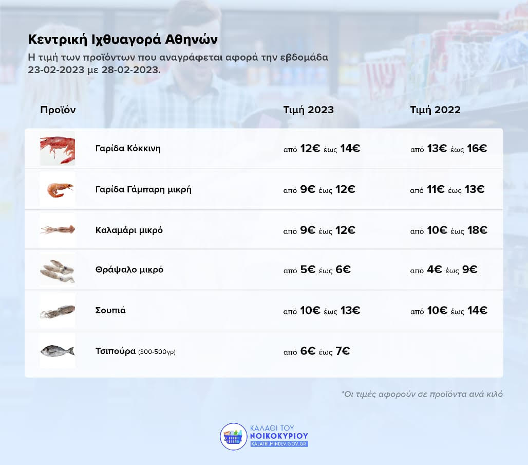 Επισυνάπτεται ο σχετικός πίνακας με τις τιμές που θα ισχύσουν από σήμερα, 22-02-2023 έως και την Τρίτη 28-02-2023 στην Κεντρική Ιχθυαγορά Αθηνών.