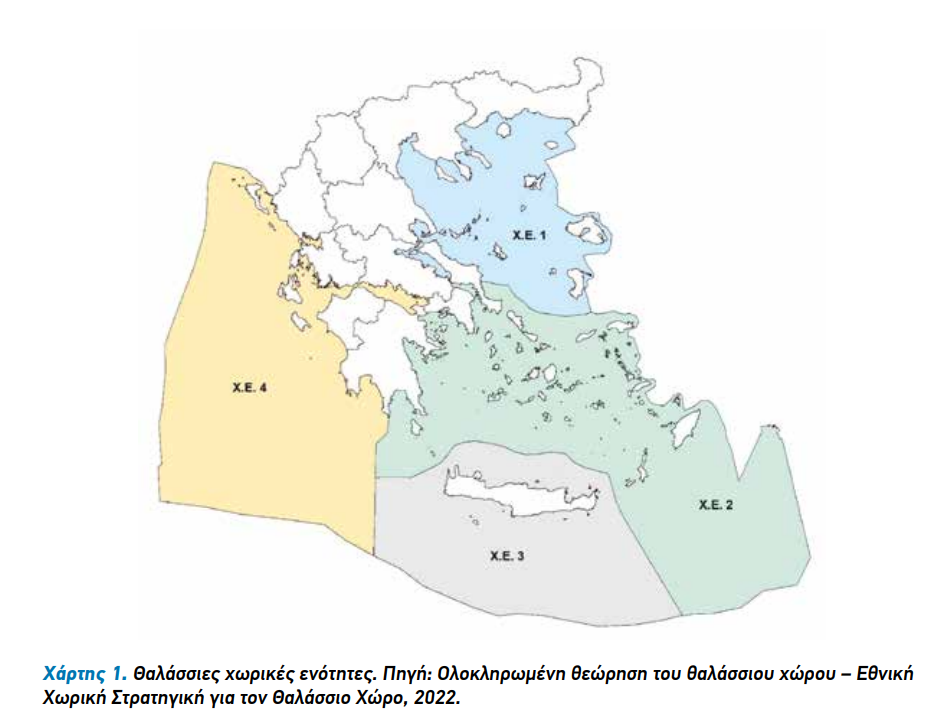 Σύμφωνα με το ΥΠΕΝ (και την Εθνική Στρατηγική) η Ελλάδα έχει χωριστεί σε 4 μεγάλες θαλάσσιες περιοχές για τις οποίες θα γίνουν ξεχωριστά σχέδια: Βόρειο Αιγαίο, Δωδεκάνησα – Κυκλάδες (Νότιο Αιγαίο), Ιόνιο (περιλαμβανομένων των περιοχών νοτίως της Πελοποννήσου) και Κρήτη. Η επιλογή του διαχωρισμού αυτού έγινε κυρίως για να συμπίπτουν με διοικητικά όρια αλλά τεκμηριώνεται και επιστημονικώς μας λένε, με ορισμένες προσεγγίσεις. Που δεν είναι και πάντα ανέφελες: για παράδειγμα το στενό του Ευρίπου και η θαλάσσια περιοχή της Χαλκίδας φαίνεται να χωρίζεται στη μέση, με το ένα της μέρος να ανήκει στο Βόρειο Αιγαίο και το άλλο στο Νότιο Αιαγίο – εκατέρωθεν της παλαιάς γέφυρας, εκτιμάται…