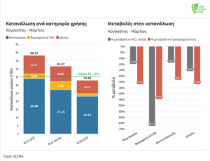 - μείωση κατά 20.9% της συνολικής κατανάλωσης ορυκτού αερίου σε σχέση με τον μέσο όρο πενταετίας το οκτάμηνο Αυγούστου 2022 – Μαρτίου 2023.