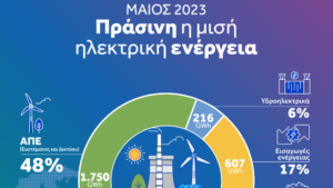 Νέο ιστορικό υψηλό τον Μάιο 2023 κατέγραψαν οι ΑΠΕ συμμετέχοντας κατά 48% -σχεδόν κατά το ήμισυ- στο ενεργειακό μείγμα, ενώ η παραγωγή από λιγνίτη ήταν μόλις 5%, όπως προκύπτει από τα μηνιαία στοιχεία του ΑΔΜΗΕ αναφέρει το ΑΠΕ-ΜΠΕ.