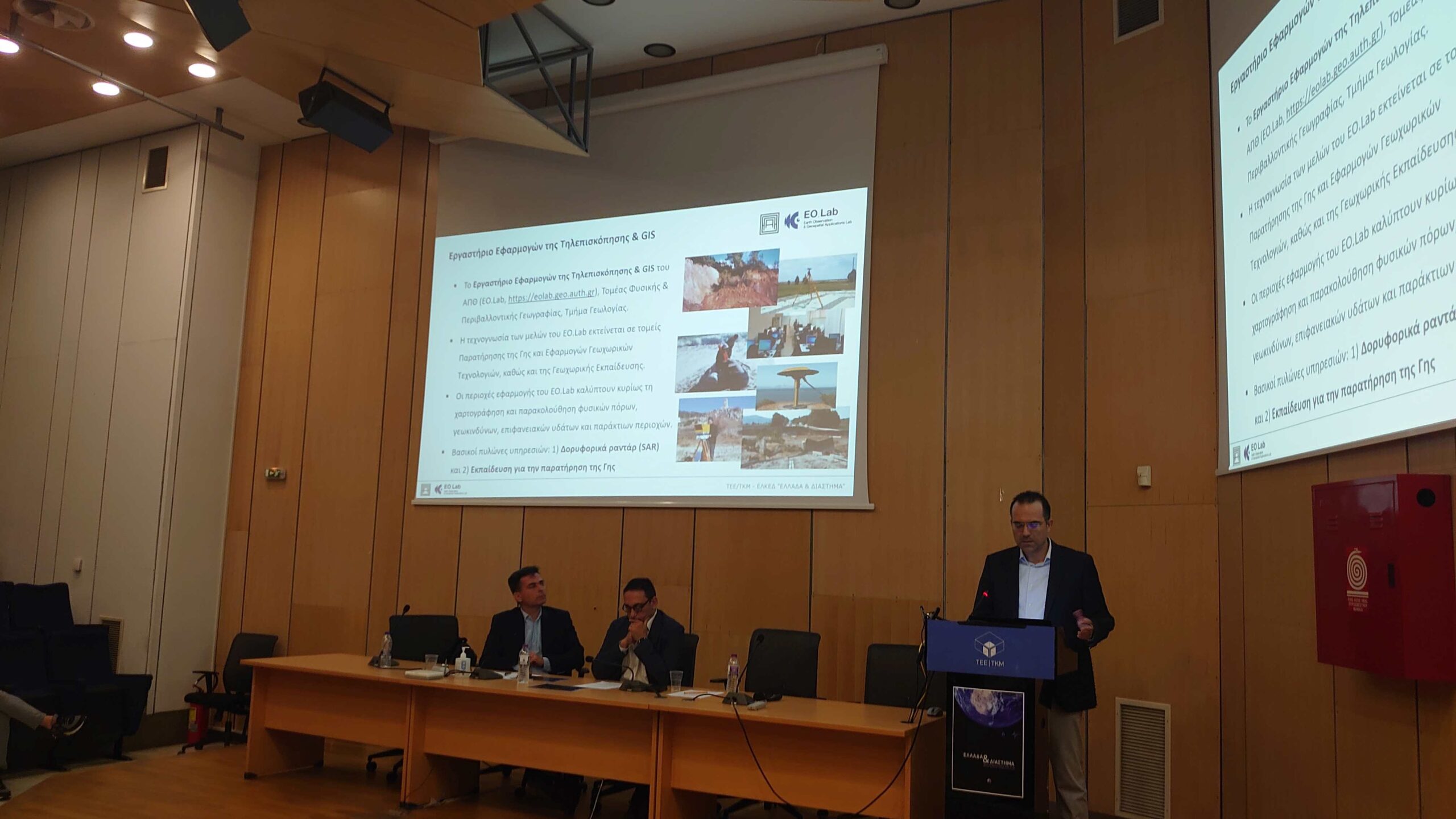 Στη συζήτηση παρουσιάστηκαν και οι δραστηριότητες και οι υπηρεσίες Δορυφορικής Τηλεπισκόπησης του Κέντρου Παρατήρησης Γης και Ωκεανών, του ΚΕΔΕΚ του ΑΠΘ. Για το Εργαστήριο Εφαρμογών Τηλεπισκόπησης και GIS του τμήματος Γεωλογίας του ΑΠΘ και για το Κέντρο Διεπιστημονικής Έρευνας και Καινοτομίας (ΚΕΔΕΚ) που ιδρύθηκε το 2003 μίλησε ο κ. Αντώνιος Μουρατίδης. Ο κ. Μουρατίδης περιέγραψε τη χρήση δεδομένων από την Οικογένεια Δορυφόρων Sentinel, τις δυνατότητες της τεχνολογίας Snapping PSI που έχουν αυτά τα συστήματα ώστε να γίνεται σύγκριση σε μια περίοδο χρόνου των χαρακτηριστικών μια περιοχής, ενώ εξήγησε ταυτόχρονα πως σημαντική παράμετρος είναι η επεξεργασία πλέον των εικόνων κάθε είδους από δορυφόρους να γίνεται on line και οι επιστήμονες να κατεβάζουν τα δεδομένα που έχουν ανάγκη, μια «σημαντική καινοτομία». Ο κ. Μουρατίδης τόνισε πως στη νέα πλέον εποχή του Διαστήματος «υπάρχει πλέον τεράστια προσφορά σε δορυφορικά προϊόντα και δεδομένα» προς τους επιστήμονες και την κοινωνία την ίδια ώρα παραδέχτηκε πως το γενικό κοινό περιμένει να κάνει χρήση αυτών των τεχνολογιών. «Κατανοούμε την ανάγκη της κοινωνίας να έχει απτά αποτέλεσμα και κινούμαστε σε αυτή την κατεύθυνση», σχολίασε ο επιστήμονας του ΑΠΘ που πάντως εξήγησε πως έχει γίνει αρκετά εύκολο για το μέσο χρήστη να παράξει αποτέλεσμα, αυτό όμως «δεν είναι όμως ακόμα αρκετά εύκολο για όλους», όπως χαρακτηριστικά σχολίασε.