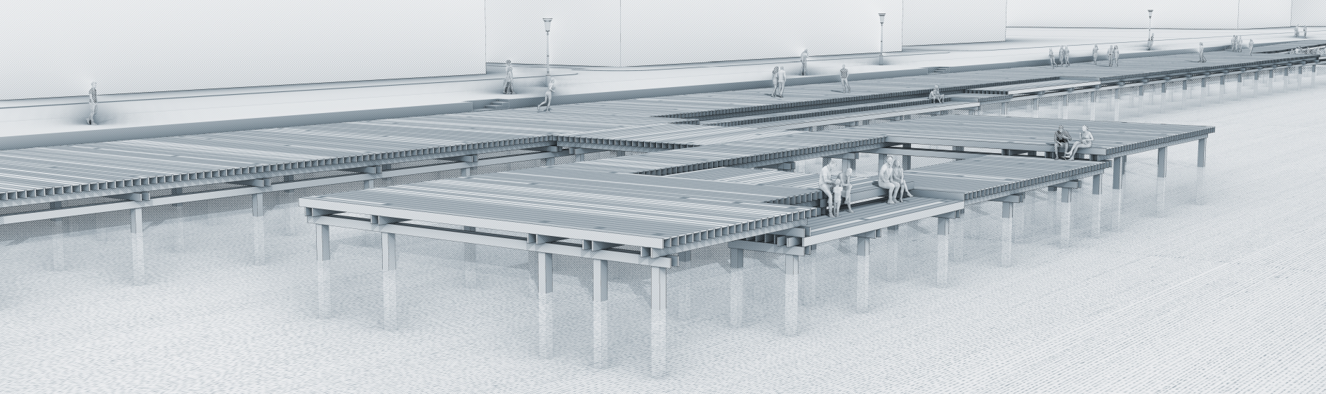 Οι μελετητές πρότειναν δύο χωρικές ζώνες που διατρέχουν παράλληλα όλο το θαλάσσιο μέτωπο της παλιάς παραλίας. Η ζώνη της επέκτασης και η ζώνη του υφιστάμενου κρηπιδώματος-πεζοδρομίου είναι διακριτές, ώστε με τα διαφορετικά ποιοτικά χαρακτηριστικά τους να προσφέρουν διαφορετικές εμπειρίες και συναισθήματα στους χρήστες τους.
