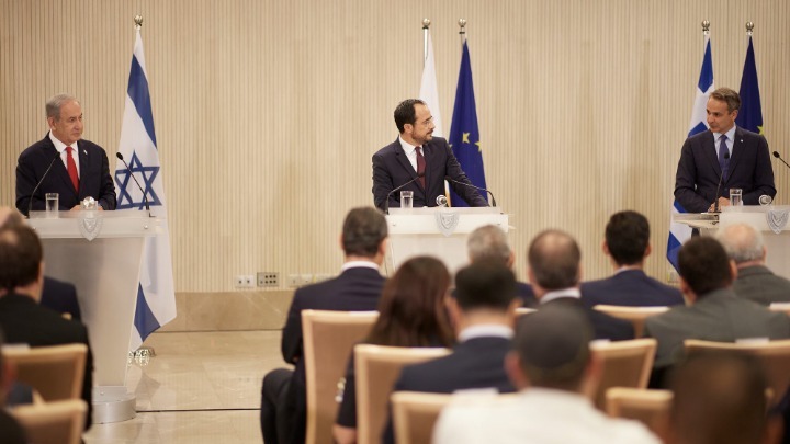 Στη δυνατότητα επέκτασης της τριμερούς συνεργασίας Κύπρου – Ελλάδας – Ισραήλ με την συμμετοχή και άλλων χωρών, όπως της Ινδίας, αναφέρθηκε ο πρωθυπουργός Κυριάκος Μητσοτάκης,