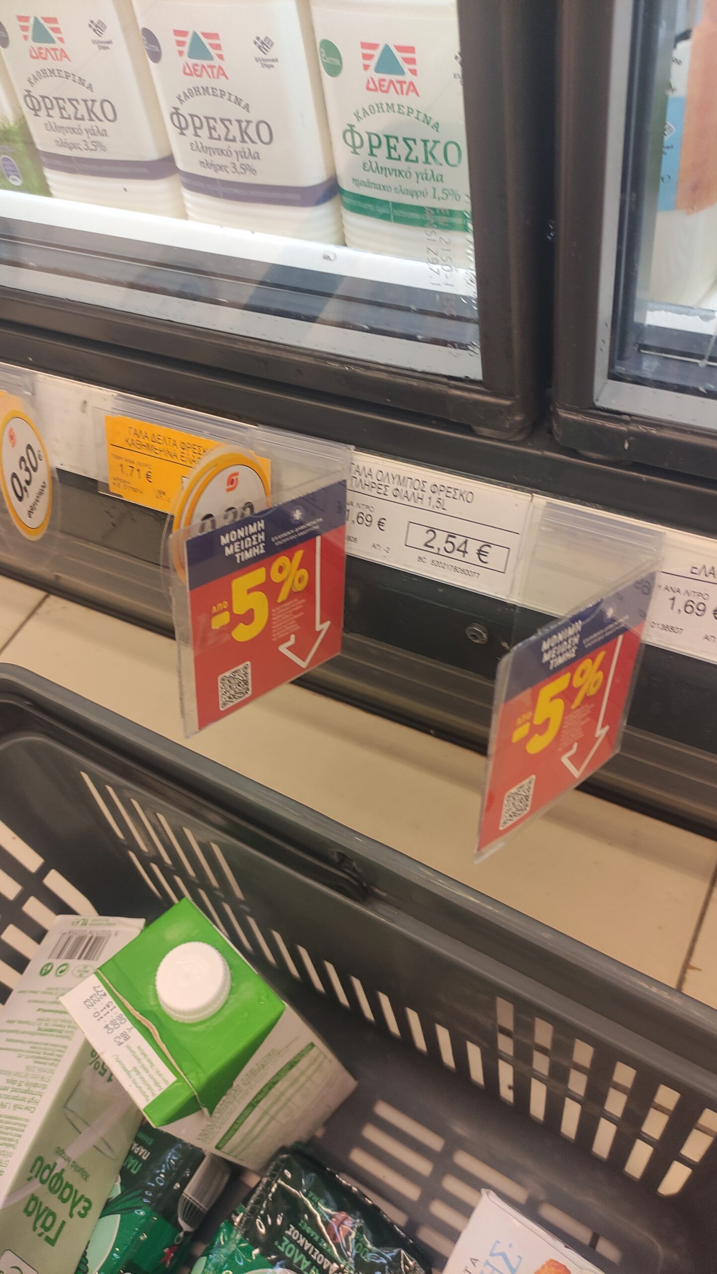 Οι αλυσίδες πήραν την ίδια τιμή από τον προμηθευτή ανεξάρτητα αν είχαν βάλει το ειδικό ταμπελάκι. Η έκπληξη ήρθε από δύο αλυσίδες που δεν αρκέστηκαν στο -5% και ανέβασαν τη μείωση της τιμής στο 6,9% αφού το ταμπελάκι για το 1,5 λίτρο είχε τιμή τα 2,54 ευρώ. Ακόμη αλυσίδα είχε προσφορά το ίδιο προϊόν στην τιμή των 2,08 ευρώ.
