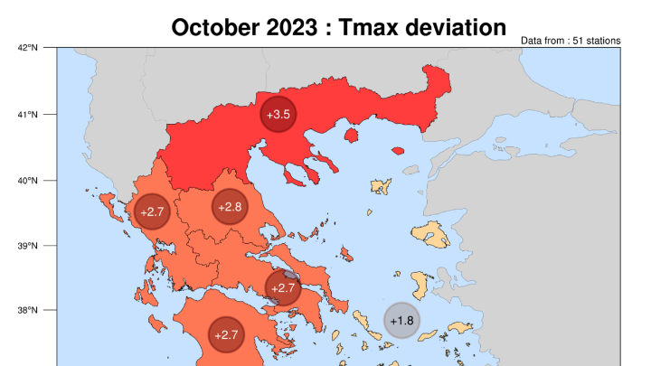 Συγκεκριμένα, με βάση το δίκτυο 51 μετεωρολογικών σταθμών του Εθνικού Αστεροσκοπείου Αθηνών/meteo.gr που λειτουργούν ανελλιπώς από το 2010 μέχρι σήμερα, τον φετινό Οκτώβριο, η μέση τιμή των μέγιστων ημερήσιων θερμοκρασιών κυμάνθηκε σε ακραία υψηλά επίπεδα σχεδόν στο σύνολο της χώρας, σε σχέση με τον μέσο όρο της περιόδου 2010-2019.