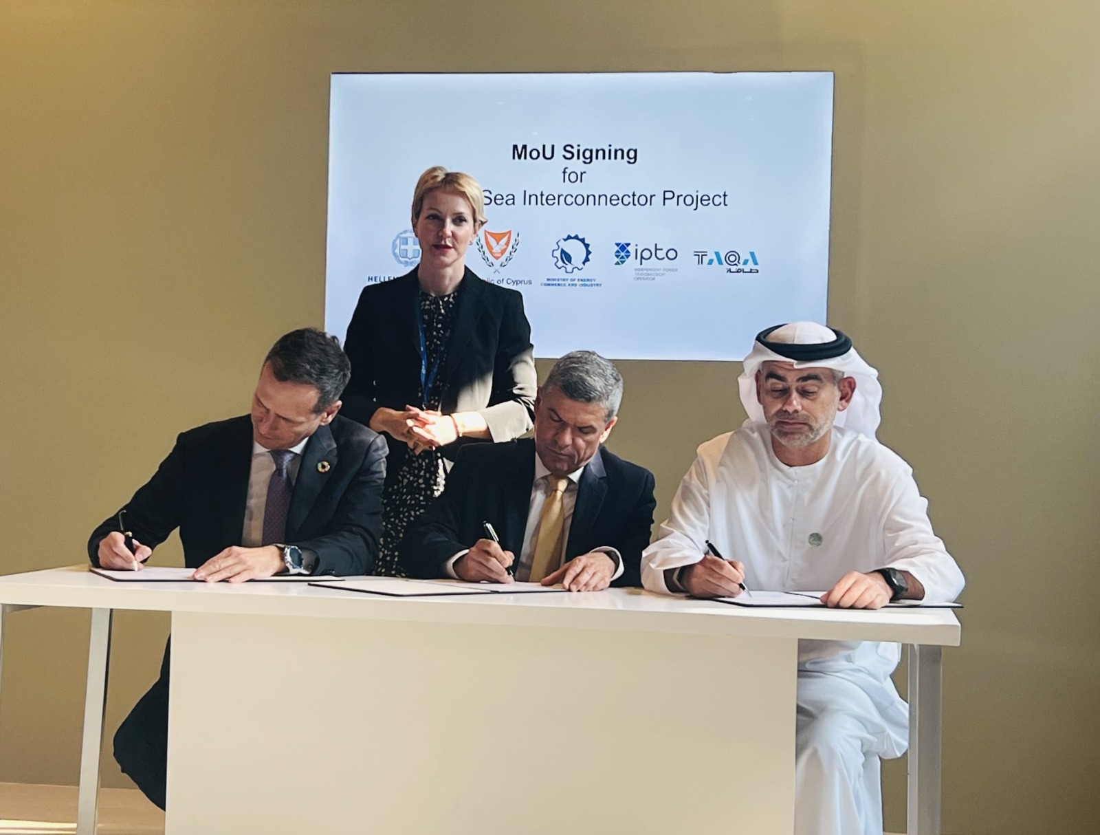 Πηγή Εικόνας: ΥΠΕΝΜνημόνιο Κατανόησης (MoU) μεταξύ του Ανεξάρτητου Διαχειριστή Μεταφοράς Ενέργειας της Ελλάδας (ΑΔΜΗΕ), του Υπουργείου Ενέργειας, Εμπορίου και Βιομηχανίας της Κύπρου και της TAQA, καθετοποιημένου ενεργειακού ομίλου με έδρα το Άμπου Ντάμπι υπεγράφη χθες, Δευτέρα 4 Δεκεμβρίου, στο ελληνικό περίπτερο στην COP 28 στο Ντουμπάι.