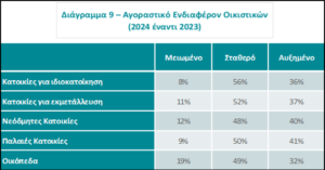 Το αγοραστικό ενδιαφέρον απορρέει σχεδόν εξίσου από τις ανάγκες για ιδιοκατοίκηση και επένδυση και μοιράζεται μεταξύ νεόδμητων κατοικιών με βιοκλιματικά χαρακτηριστικά και παλαιότερων ακινήτων για ανακαίνιση, ενώ το ενδιαφέρον για τα οικόπεδα είναι συγκριτικά περιορισμένο. Οι τιμές των οικιστικών ακινήτων αναμένεται να παραμείνουν στα σημερινά αυξημένα επίπεδα σύμφωνα με το 53% των ερωτηθέντων ενώ το 44% προβλέπει περαιτέρω αύξηση.