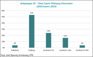 Σύμφωνα με την έρευνα, «ένα ιδιαίτερα ενδιαφέρον συμπέρασμα όπως προκύπτει από την ετήσια έρευνα της CPS, αφορά τον ρόλο που παίζουν τα ESG χαρακτηριστικά στην αγορά κατοικίας. Συγκεκριμένα προκύπτει ότι οι τιμές πώλησης κατοικιών υψηλής ενεργειακής κατάταξης εμφανίζουν εντονότερες αυξητικές τάσεις που φθάνουν έως 20%. Αντιθέτως για τις τιμές μίσθωσης, οι απόψεις διίστανται με το 60% των ερωτηθέντων να προβλέπουν σταθεροποίηση καθώς τα ενοίκια έχουν πλέον φθάσει σε οριακά επίπεδα για το μέσο ελληνικό νοικοκυριό που αδυνατεί να ανταποκριθεί στα σημερινά αυξημένα επίπεδα τιμών. Παρά ταύτα 40% των ερωτηθέντων προβλέπει αύξηση, που όμως δε θα ξεπεράσει το 10%. Το συγκεκριμένο εύρημα αποτελεί δείγμα της έλλειψης ομοιογένειας ως προς την αποτίμηση των «πράσινων» – ESG χαρακτηριστικών στην οικιστική αγορά, όπου θεσμικοί και μεμονωμένοι επενδυτές αξιολογούν με μεγαλύτερο βάρος τις νέες βιώσιμες τάσεις, ενώ η μεγαλύτερη μερίδα των συμμετεχόντων στην αγορά αξιολογεί ως σημαντικότερα τα πιο παραδοσιακά κριτήρια επιλογής κατοικίας, αξιολογώντας ως δευτερεύοντα τα πλεονεκτήματα μια πράσινης κατοικίας».