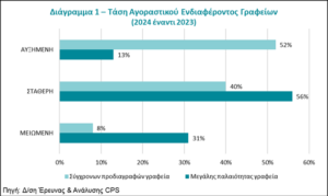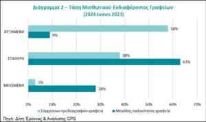 Αναφορικά με τα γραφεία η συντριπτική πλειονότητα των ερωτηθέντων προβλέπει ότι τόσο το αγοραστικό όσο και μισθωτικό ενδιαφέρον για σύγχρονα γραφεία θα έχει σταθεροποιητικές έως και αυξητικές τάσεις σε αντίθεση με τους παλαιότερους γραφειακούς χώρους. Μάλιστα θεωρούν ότι θα συνεχίσει να υπάρχει αυξημένη ζήτηση για γραφεία με πράσινα χαρακτηριστικά, υψηλής ενεργειακής κατάταξης και περιβαλλοντικές πιστοποιήσεις.