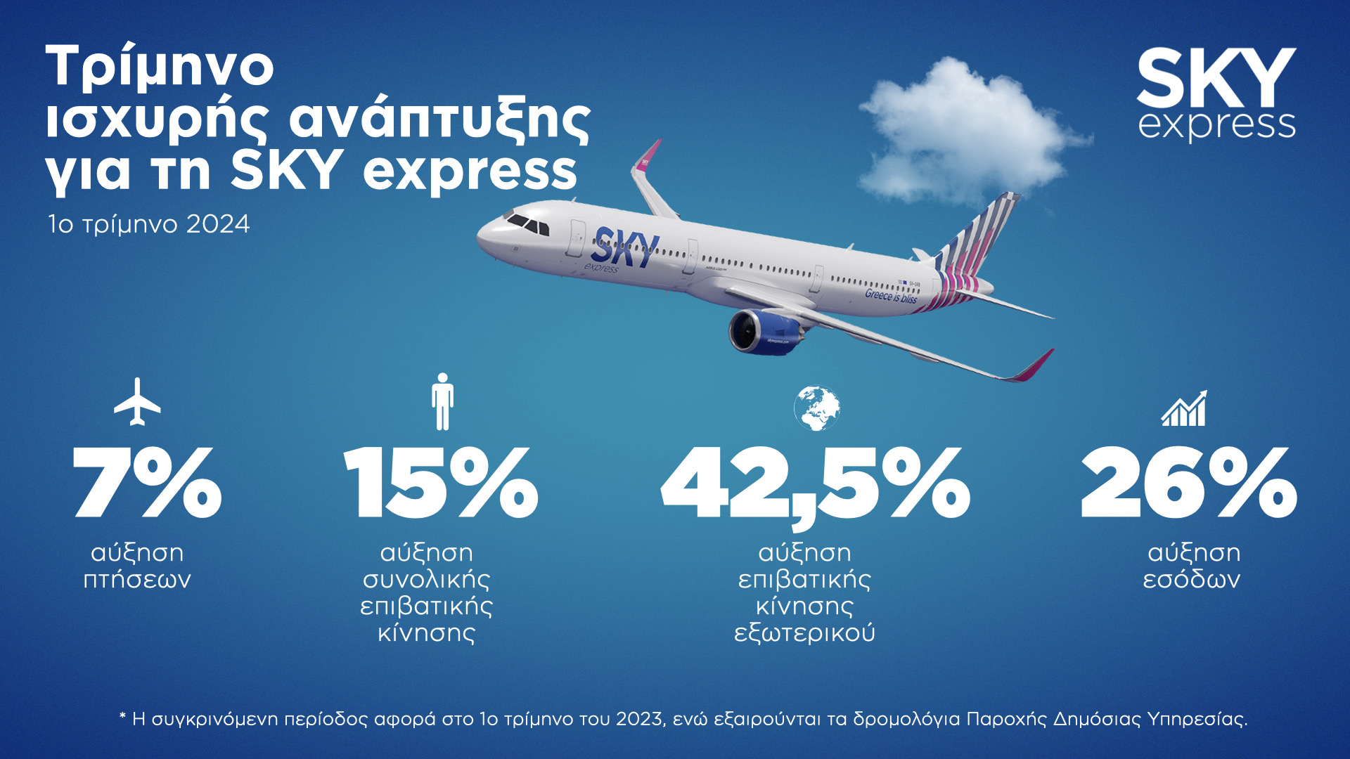 Ισχυρή ανάπτυξη το πρώτο τρίμηνο του έτους, καταγράφοντας συνολική αύξηση επιβατικής κίνησης 15% σε σχέση με το αντίστοιχο τρίμηνο του 2023 σημείωσε η SKY express.