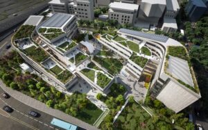 Στο οικόπεδο αυτό θα κατασκευασθούν δύο όγκοι κτιρίων ανεξάρτητοι μεταξύ τους με κοινούς χώρους στάθμευσης σε δυο υπόγεια, τα οποία θα επεκτείνονται και εκτός του περιγράμματος των κτιρίων. Η ανωδομή αποτελείται από δύο ξεχωριστά κτίρια γραφείων με ισόγειο και τέσσερα επίπεδα. Τα δυο κτίρια έχουν αποτύπωμα σε σχήμα ‘Γ’ (μπούμερανγκ) και χωροθετούνται αντικριστά μεταξύ τους, δημιουργώντας έναν εσωτερικό κήπο – αυλή. Από το δεύτερο επίπεδο τα κτίρια υψώνονται με σταδιακή υποχώρηση μέχρι το τελευταίο επίπεδο δημιουργώντας αλλεπάλληλα φυτεμένα δώματα. Στους υπέργειους χώρους του κτιρίου θα εφαρμοστεί βιοκλιματικός σχεδιασμός με σκοπό την εξασφάλιση συνθηκών θερμικής και οπτικής άνεσης με την ελάχιστη δυνατή κατανάλωση συμβατικής ενέργειας. Το έργο πρόκειται να πιστοποιηθεί βάσει του συστήματος αειφόρου ανάπτυξης LEED σε επίπεδο «Gold».