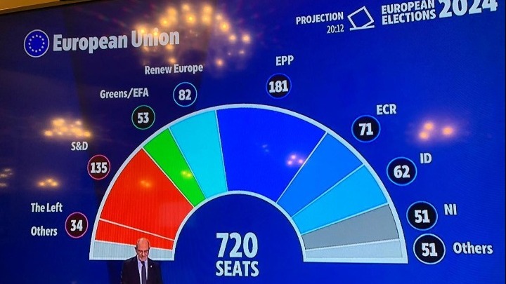 Συγκεκριμένα, το ΕΛΚ βγάζει 181 έδρες, οι Σοσιαλιστές 135 έδρες, το Renew 82 έδρες, το κόμμα Ευρωπαίοι Συντηρητικοί και Μεταρρυθμιστές (ECR) 71 έδρες και το κόμμα Ταυτότητα και Δημοκρατία (ID) 62 έδρες, οι Πράσινοι 53 έδρες και η Ευρωπαϊκή Αριστερά (GUE) 34 έδρες. Ο αριθμός των Μη Εγγεγραμμένων (NI) είναι 51, ενώ οι νέες έδρες που μένει να αποφασιστεί σε ποιά πολιτική ομάδα θα ενταχθούν, είναι 51.