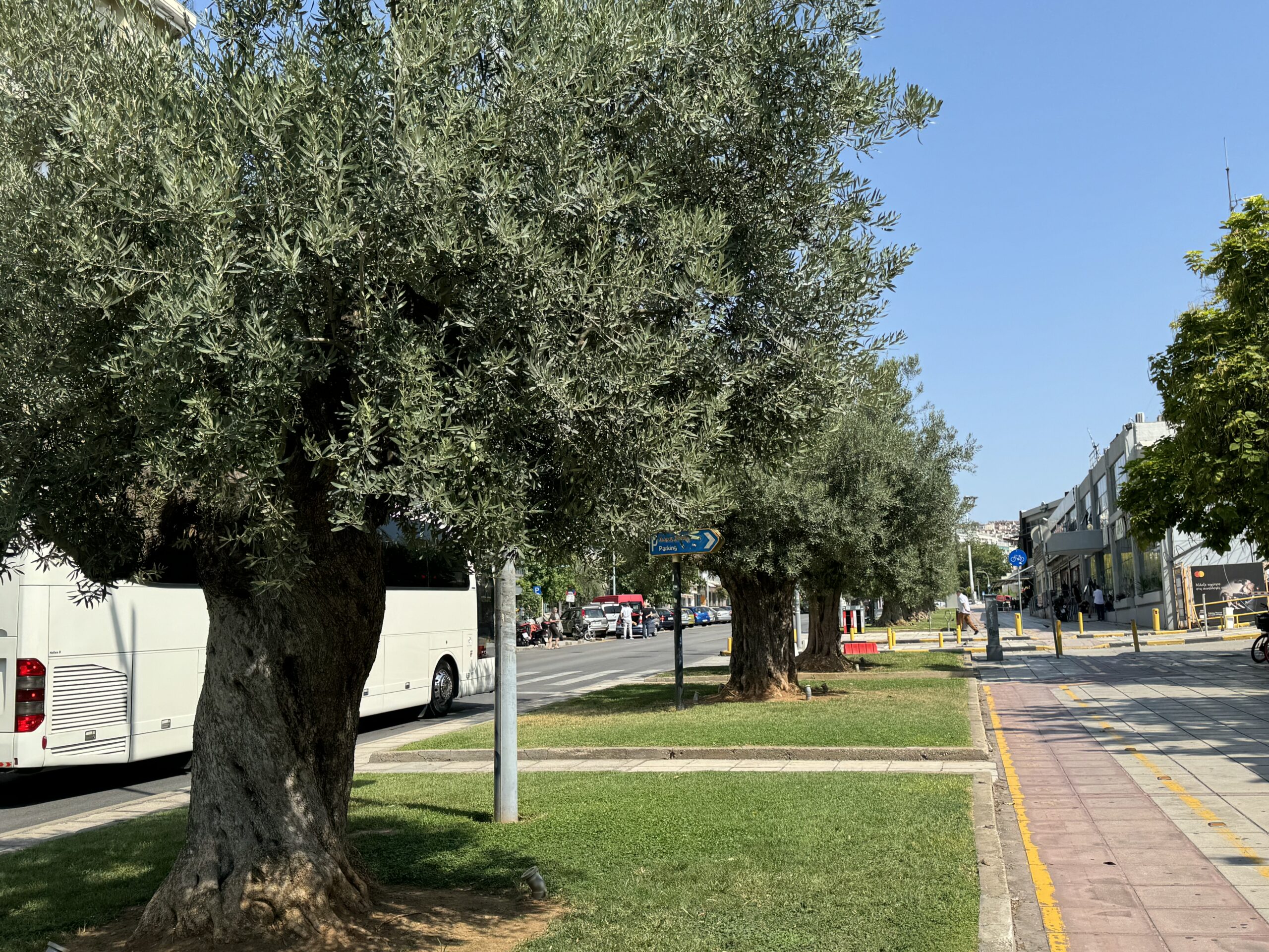 Οι τριάντα υπεραιωνόβιες ελιές επί της οδού Αγγελάκη τοποθετήθηκαν τον Απρίλιο του 2020, αποτελώντας χορηγία του επιχειρηματία Σταύρου Ανδρεάδη προς την πόλη, ώστε να αντικαταστήσουν τις λεύκες που ήταν επικίνδυνες και παρουσίασαν προβλήματα ευστάθειας.