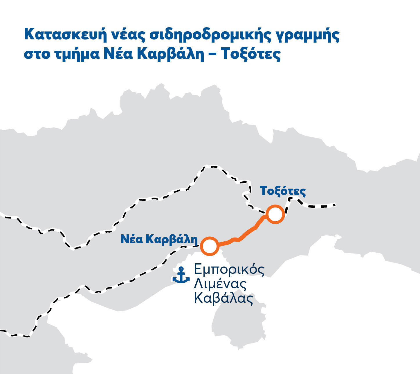 Το έργο με εξασφαλισμένη χρηματοδότηση από τον Μηχανισμό «Συνδέοντας την Ευρώπη(CEF) 2021-2027», αφορά σε εργασίες για την κατασκευή της υποδομής, επιδομής και σταθμών/στάσεων για νέα μονή σιδηροδρομική γραμμή στο τμήμα Ν. Καρβάλη – Τοξότες (περιοχή Ξάνθης), μήκους 32 χλμ. περίπου, καθώς και του κλάδου από Ν. Καρβάλη προς τον νέο εμπορευματικό λιμένα Καβάλας, μήκους 5,3 χλμ. περίπου.