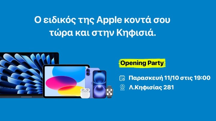 Η Apple προσκαλεί, την Παρασκευή 11 Οκτωβρίου 2024, στις 19:00, όλους τους Apple fans, στα εγκαίνια του νέου καταστήματος iStorm στη Λεωφόρο Κηφισίας 281, για να ανακαλύψουν τον νέο Apple προορισμό.