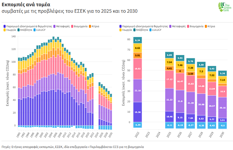 - Το 83% αυτής της μείωσης θα προέλθει από τους τομείς της παραγωγής ηλεκτρισμού & θερμότητας (-90 Mt CO2eq) και της βιομηχανίας (-31 Mt CO2eq) που ήταν οι πιο ρυπογόνοι την περίοδο 2018-2022.