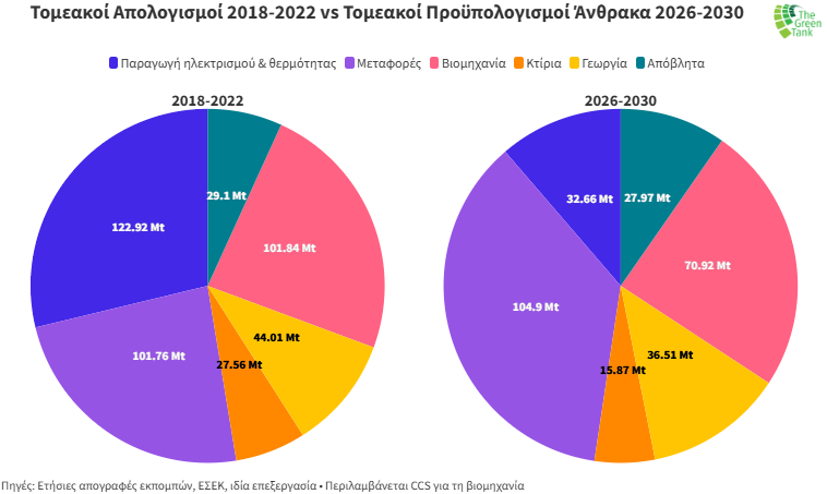- Οπισθοδρόμηση θα σημειωθεί στον τομέα των μεταφορών (+3.1 Mt CO2eq), ο οποίος θα είναι με διαφορά ο πιο ρυπογόνος τομέας με 105 Mt CO2eq την πενταετία 2026-2030, κατέχοντας μερίδιο σχεδόν 41% του συνολικού προϋπολογισμού άνθρακα της χώρας.