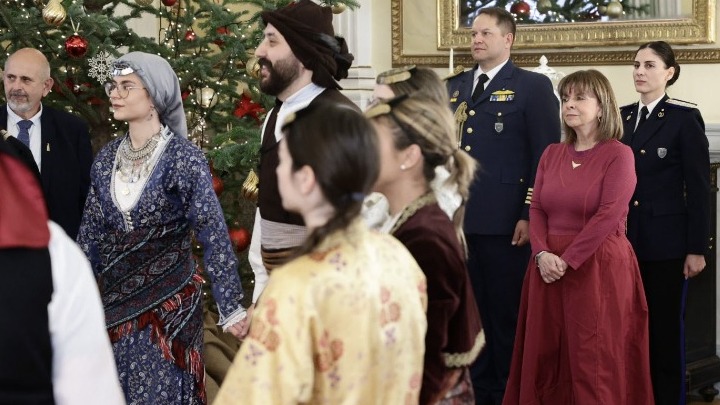 Χριστουγεννιάτικα Κάλαντα και ευχές από κάθε γωνιά της Ελλάδας άκουσε σήμερα η Πρόεδρος της Δημοκρατίας Κατερίνα Σακελλαροπούλου στην καθιερωμένη χριστουγεννιάτικη εκδήλωση στην Προεδρία της Δημοκρατίας.