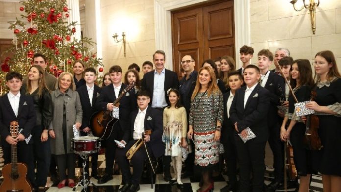 Τα κάλαντα από διάφορες περιοχές της Ελλάδας είπαν στον πρωθυπουργό και την οικογένειά του, μέλη του Λυκείου των Ελληνίδων, του Σώματος Ελληνικού Οδηγισμού και του Μουσικού Σχολείου Πτολεμαΐδας.