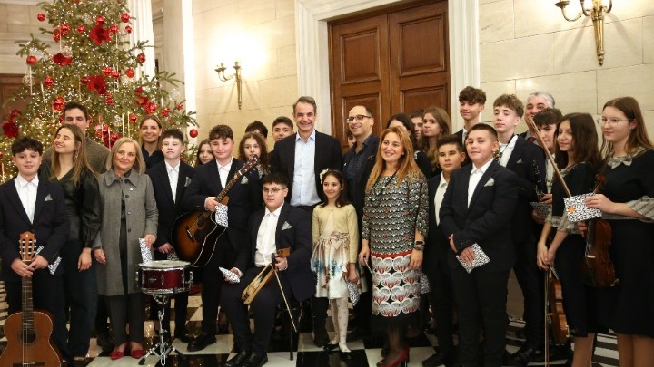 Τα Χριστουγεννιάτικα κάλαντα άκουσαν σήμερα στο Μέγαρο Μαξίμου ο πρωθυπουργός Κυριάκος Μητσοτάκης, η σύζυγός του Μαρέβα Γκραμπόφσκι-Μητσοτάκη και τα παιδιά τους Σοφία, Κωνσταντίνος και Δάφνη.