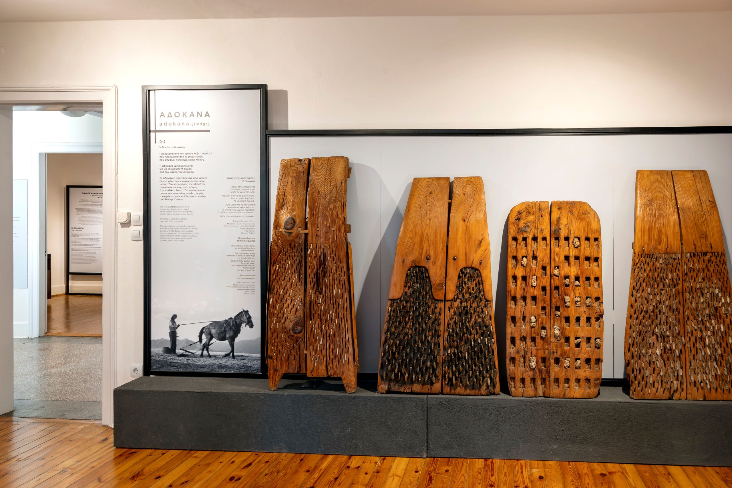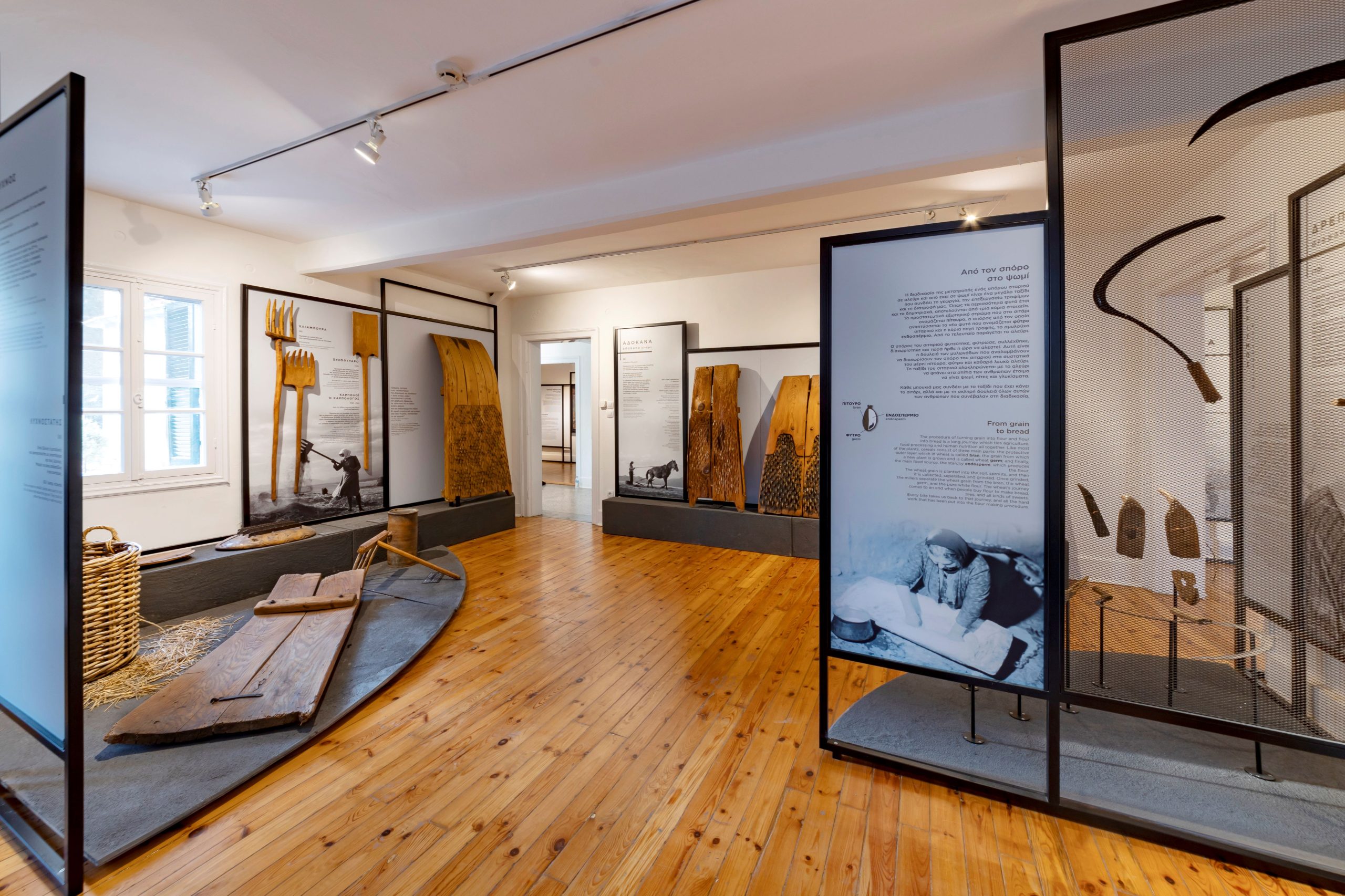 Κυρίαρχο αντικείμενο στο σπίτι των εργαλείων είναι το αλέτρι, ένα εργαλείο – σύμβολο, αφού πρόκειται για το πρώτο εργαλείο που χρησιμοποίησε ο άνθρωπος για να καλλιεργήσει τη γη. Το αλέτρι όργωνε και ανάδευε το χώμα για να μπορέσει να υποδεχτεί το σπόρο, όμως επειδή οι σβώλοι ήταν σκληροί και μεγάλοι, ο θρυμματισμός τους γινόταν με τη βοήθεια της σβάρνας. Η αδοκάνα ήταν το εργαλείο που χρησιμοποιούσαν οι οικογένειες αμέσως μετά τον θερισμό για να σπάσει το φλοιό του σπόρου του σιταριού. Ήταν ξύλινη και στην πλευρά που έρχεται σε επαφή με το έδαφος είχε σφηνοειδείς πετρούλες από μάρμαρο ή ασβεστόλιθο ή μεταλλικές σφήνες. Τα δρεπάνια αναλάμβαναν δράση για τον θερισμό ενώ το εργαλείο για το λίχνισμα ήταν η ξύλινη χλιάμπουρα που έμοιαζε με τζουγκράνα ή πηρούνα με αραιά δόντια. Με αυτήν, οι γυναίκες κυρίως σήκωναν το άχυρο στον αέρα ώστε εκείνος να παρασύρει ό,τι ήταν ελαφρύ και να μείνει στο έδαφος ο σπόρος. Το άχυρο μαζευόταν για ζωοτροφή και οι σπόροι για το αλεύρι του σπιτιού.