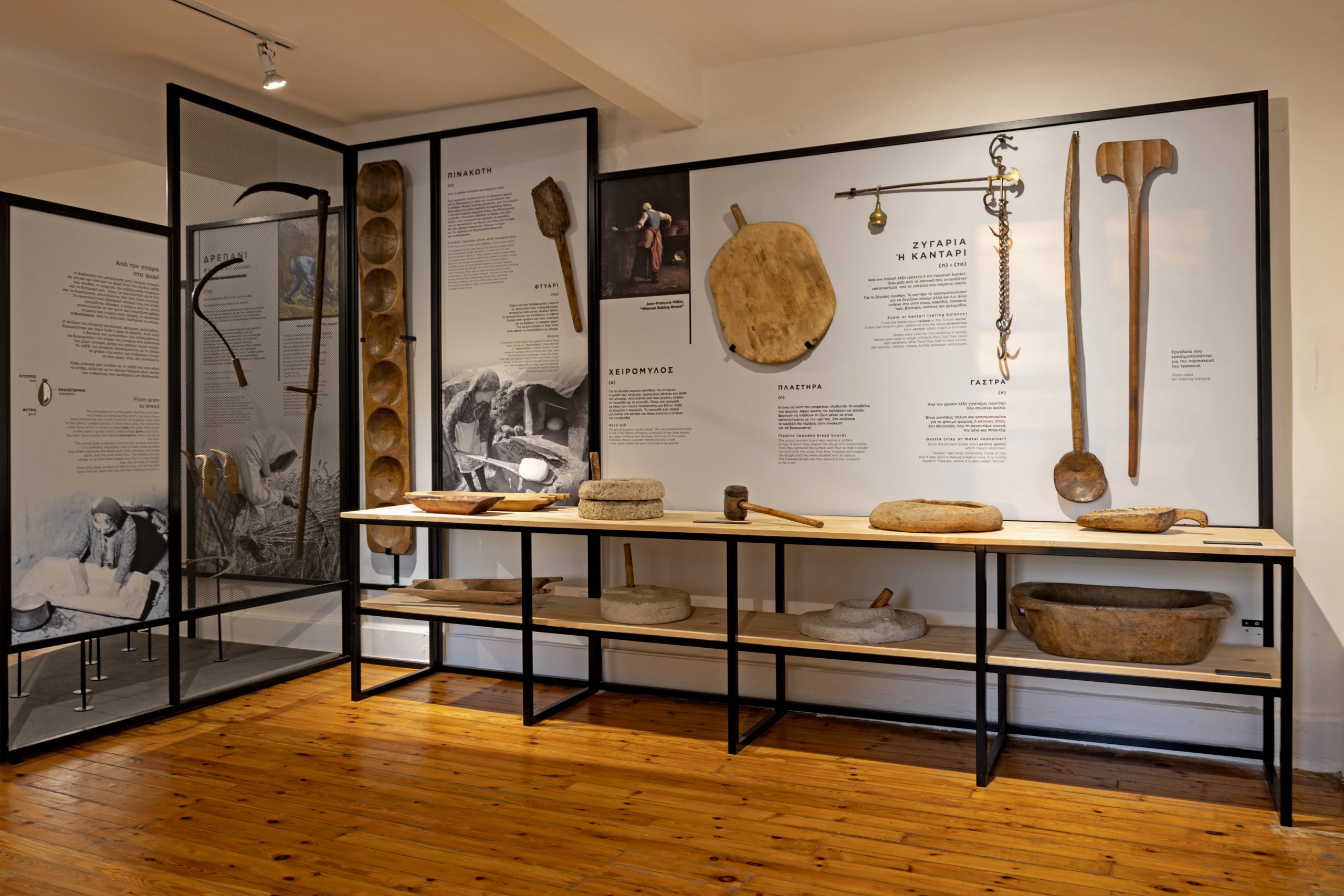Στον ίδιο χώρο βρίσκονται συγκεντρωμένα διάφορα αντικείμενα απαραίτητα για την καθημερινότητα, όπως η πήλινη γάστρα, οι πινακωτές – λαξευμένες σε κορμούς δέντρων -, η ζυγαριά ή καντάρι, ο χειρόμυλος, οι μυλόπετρες, η πλαστήρα και τα εργαλεία για την παρασκευή του τραχανά. Λίγο μακρύτερα φυλάσσονται το αλέτρι, εργαλείο – σύμβολο της αγροτικής ζωής, η σβάρνα για τον θρυμματισμό των σβώλων στο όργωμα, οι αδοκάνες, για το σπάσιμο του φλοιού του σπόρου σιταριού, τα δρεπάνια για τον θερισμό, η χλιάμπουρα για το λίχνισμα που άφηνε στον άνεμο το άχυρο για να μείνει στο έδαφος ο σπόρος για το αλεύρι του σπιτιού…