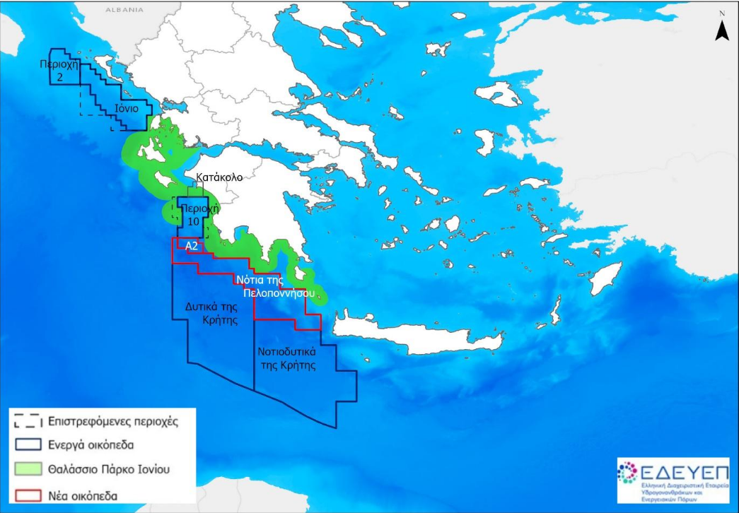 Πρώτον, απελευθερώνονται ήδη αδειοδοτημένες θαλάσσιες περιοχές έρευνας υδρογονανθράκων στο Ιόνιο Πέλαγος, οι οποίες θα διευρύνουν χωρικά και θα καταστήσουν συνεχές το Εθνικό Θαλάσσιο Πάρκο του Ιονίου, για την επίτευξη των περιβαλλοντικών στόχων του.