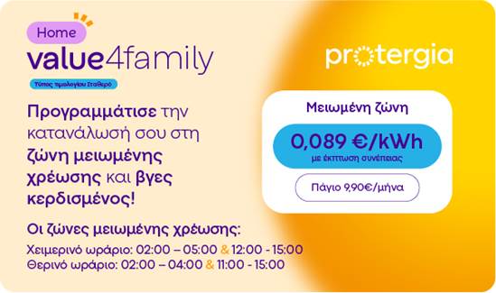 H Protergia, ιδιώτης πάροχος και αναπόσπαστο κομμάτι της METLEN Energy & Metals, ανακοίνωσε το Protergia Value 4Family. Όπως σημειώνεται σε σχετική ανακοίνωση, «πρόκειται για το νέο διζωνικό τιμολόγιο που δίνει στα καταναλωτές με υψηλές καταναλώσεις ρεύματος τη δύναμη να μειώσουν τους λογαριασμούς τους και να προσαρμόσουν την κατανάλωσή τους στις ώρες που συμφέρει περισσότερο».
