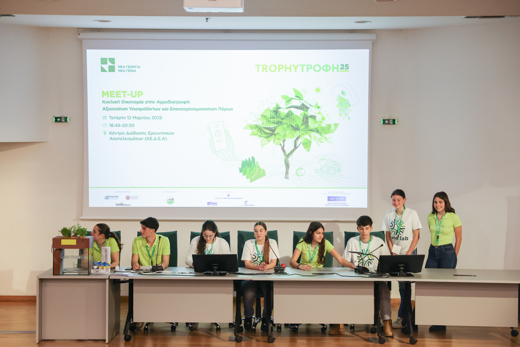 Στη συνέχεια, πραγματοποιήθηκαν παρουσιάσεις και πάνελ συζητήσεων με τη συμμετοχή -μτεαξύ άλλων- καθηγητών του ΑΠΘ και του Πανεπιστημίου Μακεδονίας, ενώ η επιχειρηματική ομάδα Loop Lab από το Πειραματικό Λύκειο του ΠΑ.ΜΑΚ παρουσίασε την πρωτοποριακή εικονική επιχείρησή της. Στο τελευταίο μέρος του προγράμματος, οι συμμετέχοντες του Meet-Up έλαβαν μέρος σε εργαστήριο παραγωγής ιδεών, όπου είχαν την ευκαιρία να αναπτύξουν και να παρουσιάσουν καινοτόμες προτάσεις σχετικές με την κυκλική οικονομία στην αγροδιατροφή. Το πρώτο TrophyΤροφή Meet-Up πραγματοποιήθηκε σε συνδιοργάνωση με το Αριστοτέλειο Πανεπιστήμιο Θεσσαλονίκης και το Διεπιστημονικό Κέντρο Αγροδιατροφής του (ΚΕΑΓΡΟ), καθώς και το Walk AUTh Innovation Accelerator. Επιπλέον, υποστηρίχθηκε από το Γραφείο Περιβαλλοντικής Διαχείρισης του Πανεπιστημίου Μακεδονίας και διοργανώθηκε υπό την αιγίδα του Εμποροβιομηχανικού Επιμελητηρίου Θεσσαλονίκης (ΕΒΕΘ), της Περιφέρειας Κεντρικής Μακεδονίας και του Δήμου Θεσσαλονίκης.