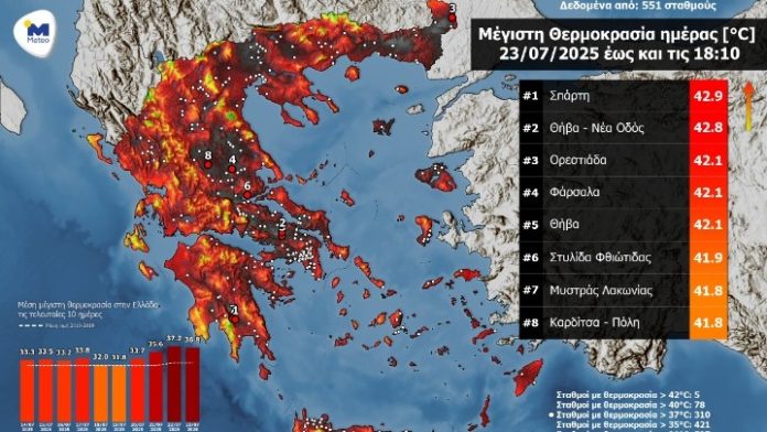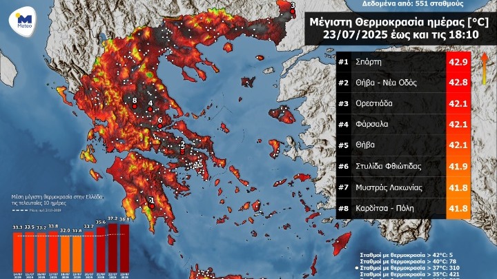 Συνθήκες καύσωνα επικράτησαν και σήμερα με τον υδράργυρο να ξεπερνά τους 40 ° C σε πολλές περιοχές της χώρας. Σύμφωνα με το δίκτυο αυτόματων μετεωρολογικών σταθμών του Εθνικού Αστεροσκοπείου Αθηνών / meteo.gr, οι υψηλότερες θερμοκρασίες της επικράτειας σημειώθηκαν στην Μακεδονία και Θράκη, στη Θεσσαλία, στην Πελοπόννησο και στην Ανατολική Στερεά, όπου πλησίασαν τους 42-43 ° C.