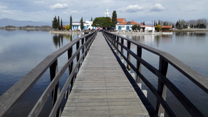 Μια διαδρομή, που προσφέρει πρωτότυπη βιοποικιλότητα και γραφική θέα, συνδυάζει την ανεπανάληπτη φυσική ομορφιά των λιμνών και των λιμνοθαλασσών της περιοχής με την πολιτιστική και θρησκευτική κληρονομιά. Η συγκεκριμένη περιηγητική διαδρομή έχει αφετηρία το μοναστήρι του Αγίου Νικολάου. Ένα εμβληματικό «πλωτό» μοναστήρι πάνω σε νησίδες, συνδεδεμένες με ξύλινες γέφυρες. Ανήκει στη μονή Βατοπαιδίου του Αγίου Όρους και αποτελεί σημαντικό προσκυνηματικό προορισμό. Η περιηγητικά διαδρομή έχει δεκαπέντε στάσεις.
