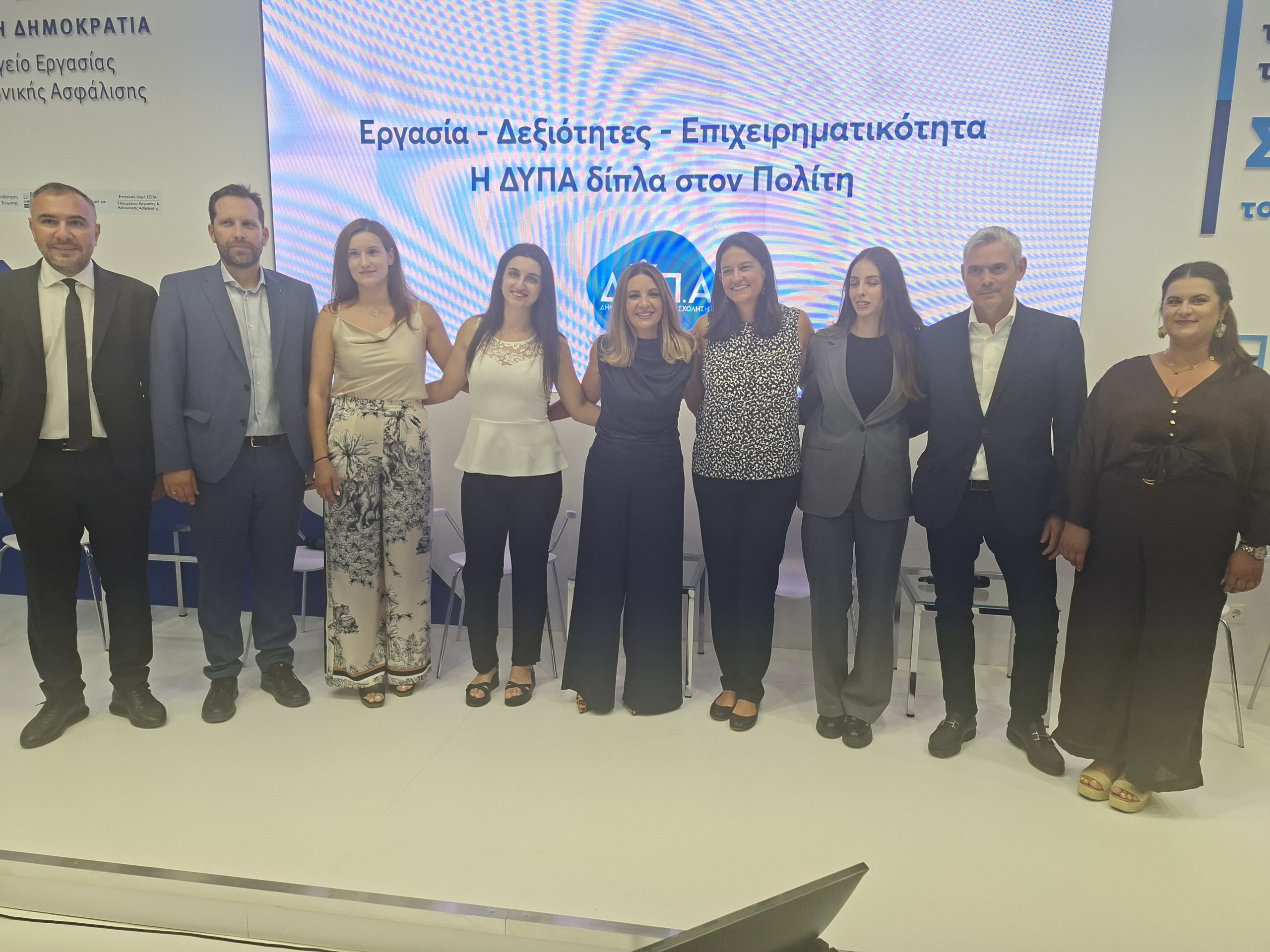 Πηγή Εικόνας: απε - μπεΤέσσερις νέες γυναίκες, των οποίων η ζωή άλλαξε επαγγελματικά μέσω της Δημόσιας Υπηρεσίας Απασχόλησης (ΔΥΠΑ), μοιράστηκαν τη δική τους ιστορία κατά τη διάρκεια της εκδήλωσης «Εργασία – Δεξιότητες – Επιχειρηματικότητα: Η ΔΥΠΑ δίπλα στον πολίτη», που πραγματοποιήθηκε στο πλαίσιο της 89ης Διεθνούς Έκθεσης Θεσσαλονίκης (ΔΕΘ), στο Περίπτερο 15, παρουσία της Υπουργού Εργασίας και Κοινωνικής Ασφάλισης, Νίκης Κεραμέως, και της Διοικήτριας της ΔΥΠΑ, Γιάννας Χορμόβα.