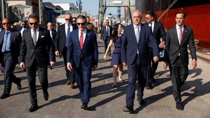 Τις εγκαταστάσεις των Ναυπηγείων Ελευσίνας επισκέφτηκε σήμερα ο υπουργός Ανάπτυξης, Τάκης Θεοδωρικάκος, όπου συναντήθηκε με τον αμερικανό υπουργό Εσωτερικών, Νταγκ Μπέργκαμ. Παρόντες στα ναυπηγεία ήταν επίσης ο υπουργός Περιβάλλοντος και Ενέργειας, Σταύρος Παπασταύρου, o υπουργός Ναυτιλίας και Νησιωτικής Πολιτικής, Βασίλης Κικίλιας και ο επιτετραμμένος της αμερικανικής πρεσβείας, Τζος Χακ. Τους υποδέχθηκε ο πρόεδρος και διευθύνων σύμβουλος της Onex Shipyards & technologies, Πάνος Ξενοκώστας.