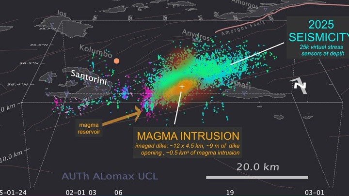 Πηγή Εικόνας: ALomax Scientific; Geophysics Department, Aristotle University of Thessaloniki, Thessaloniki, Greece; Department of Earth Sciences, University College London, UKΔιεθνής ομάδα ερευνητών, ανάμεσα τους και Έλληνες, αποκάλυψε τις κρυφές διεργασίες που οδήγησαν στην ιδιαίτερα ενεργή σεισμική δραστηριότητα κοντά στη Σαντορίνη στις αρχές του 2025. Η μελέτη τους, που δημοσιεύτηκε στο περιοδικό Science, δείχνει ότι η δραστηριότητα προκλήθηκε από μια τεράστια μαγματική διείσδυση – ένα κατακόρυφο στρώμα μάγματος – που διαδόθηκε κατά κύματα σε απόσταση μεγαλύτερη από 20 χιλιόμετρα μέσα στο φλοιό της Γης σε βάθος μεγαλύτερο από 10 χιλιόμετρα κάτω από τον πυθμένα της θάλασσας.