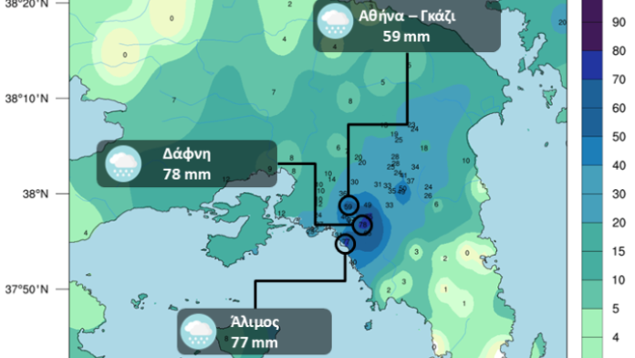 Σύμφωνα με δίκτυο αυτόματων μετεωρολογικών σταθμών του Εθνικού Αστεροσκοπείου Αθηνών / Meteo.gr μεγάλα ύψη βροχής καταγράφηκαν στα δυτικά ηπειρωτικά και στην Αττική, όπως αποτυπώνεται σε σχετικό χάρτη με το μεγαλύτερο ύψος βροχής μέχρι και τις 17:20 ώρα Ελλάδας να καταγράφεται στη Δάφνη Αττικής με 78 mm. Ακολουθούν, ο ‘Αλιμος με 77mm και ο Βύρωνας Αττικής με 75.4, ενώ αξίζει να σημειωθεί ότι στο κέντρο της Αθήνας σύμφωνα με τα στοιχεία από το δίκτυο αυτόματων μετεωρολογικών σταθμών του Εθνικού Αστεροσκοπείου Αθηνών / Meteo.gr πλησίασαν τα 60mm (58.8 mm).
