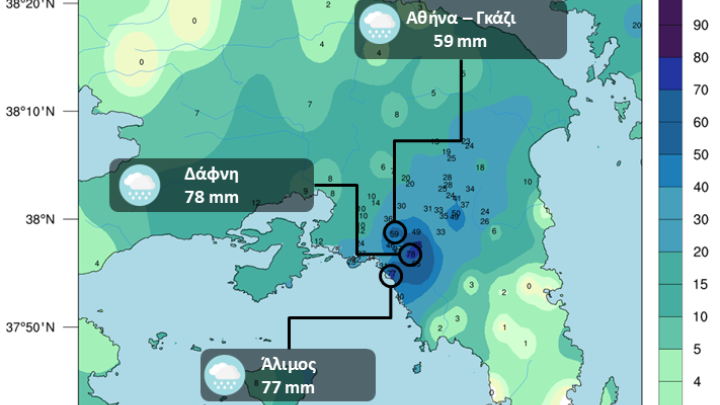Συγκεκριμένα, στην περιοχή της Αττικής, σύμφωνα με το Μετεωρολογικό και Κλιματικό Παρατηρητήριο Αττικής του Εθνικού Αστεροσκοπείου Αθηνών / Meteo.gr, με εξαίρεση τα νότια τμήματα της Αττικής, στην υπόλοιπη Αττική σημειώθηκαν σημαντικά ύψη βροχής, όπως ευδιάκριτα αποτυπώνεται σε σχετικό χάρτη. Ειδικότερα στο Γκάζι καταγράφηκαν 59mm βροχής.