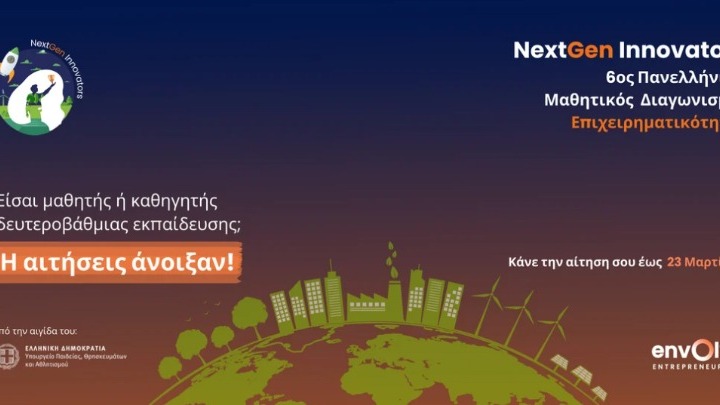 Το Envolve Entrepreneurship (envolveglobal.org) ανακοινώνει την έναρξη του 6ου Πανελλήνιου Μαθητικού Διαγωνισμού Επιχειρηματικότητας NextGen Innovators (envolveglobal.org/student-competition), προσκαλώντας μαθητές και μαθήτριες γυμνασίων, Γενικών Λυκείων και ΕΠΑΛ από όλη την Ελλάδα, αλλά και την ομογένεια, να αναπτύξουν και να παρουσιάσουν τις δικές τους καινοτόμες, βιώσιμες επιχειρηματικές ιδέες. Το NextGen Innovators τελεί υπό την αιγίδα του υπουργείου Παιδείας, Θρησκευμάτων και Αθλητισμού και αποτελεί ένα μοναδικό πρόγραμμα βιωματικής μάθησης, όπου μαθητικές ομάδες εργάζονται για να αναπτύξουν επιχειρηματικές ιδέες με ουσιαστικό περιβαλλοντικό και κοινωνικό αποτύπωμα. Οι αιτήσεις υποβάλλονται από εκπαιδευτικούς, ως υπεύθυνους ομάδων, μέσω της επίσημης φόρμας στον σύνδεσμο: https://bit.ly/nextgeninnovators.