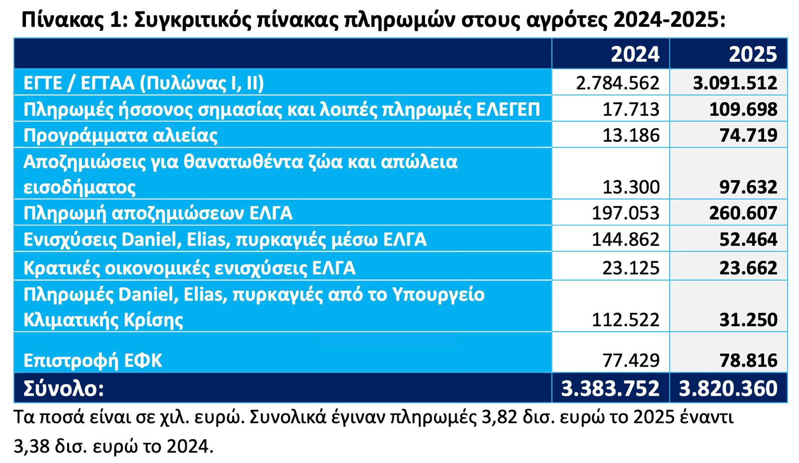 Σε ανάρτησή του στα κοινωνικά δίκτυα ο αντιπρόεδρος της κυβέρνησης, Κωστής Χατζηδάκης, επισημαίνει πως «3,82 δισ. ευρώ καταβλήθηκαν στους αγρότες μας το 2025 από τον ΟΠΕΚΕΠΕ, το υπουργείο Οικονομικών και τον ΕΛΓΑ. Το ποσό αυτό είναι το μεγαλύτερο των τελευταίων ετών και κατά 13% πιο μεγάλο από τα 3,38 δισ. ευρώ που καταβλήθηκαν το 2024».