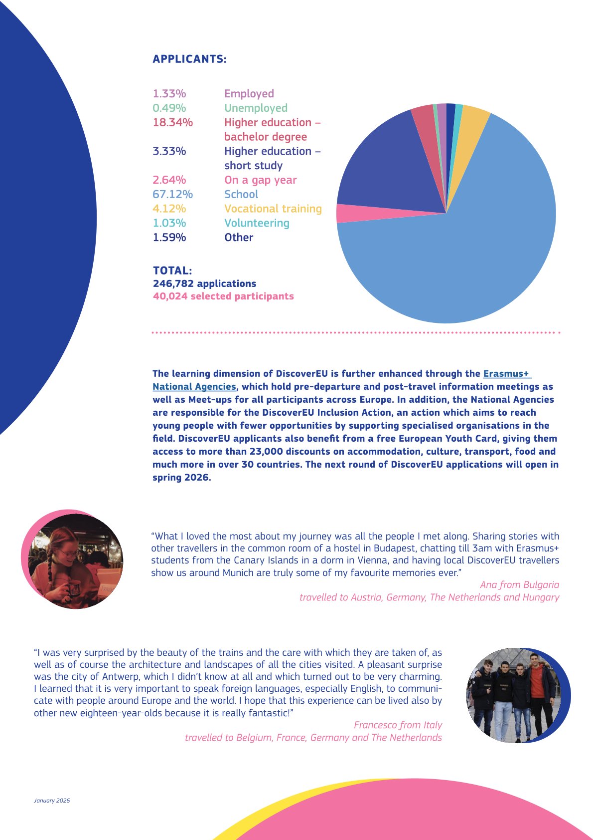 Περισσότερες πληροφορίες για το DiscoverEU, καθώς και τα αποτελέσματα ανά χώρα είναι διαθέσιμα στους παρακάτω συνδέσμους: https://youth.europa.eu/sites/default/files/inline-files/DiscoverEU_factsheet_January2026.pdf και https://youth.europa.eu/discovereu_el