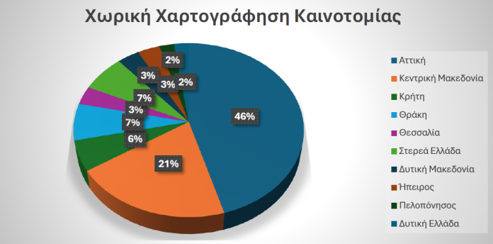 Η γεωγραφική κατανομή των εφευρέσεων αναδεικνύει 4 ισχυρούς κόμβους, με την Αττική και τη Θεσσαλονίκη να αποτελούν τους δύο μητροπολιτικούς πυλώνες, με εξειδίκευση σε: