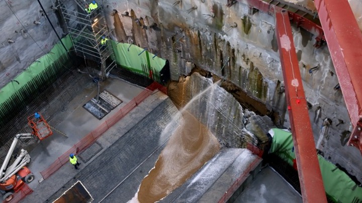 Το «ξετρύπημα» αυτό του πρώτου από τους δύο μετροπόντικες που δουλεύουν για το μεγαλύτερο δημόσιο έργο της χώρας, είναι το ορόσημο της θραύσης του τοιχίου του φρέατος, στη γλώσσα του κατασκευαστικού κλάδου ονομάζεται breakthrough (μπρέικθρου).