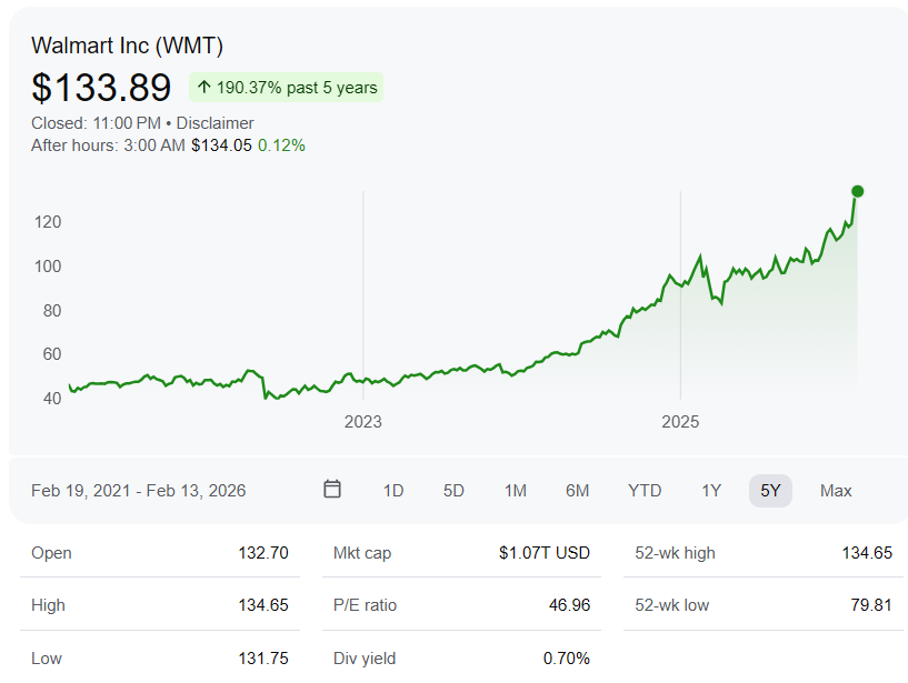 Και αυτή η ιστορία επιτυχίας, ακόμη και αν δεν υποστηρίζεται πλήρως από τις πραγματικές οικονομικές αποδόσεις, εμφανίζεται ξεκάθαρα στην αποδοχή από τους επενδυτές στη χρηματογορά και φυσικά στην μετοχή της. Η τιμή της μετοχής της Walmart σχεδόν τριπλασιάστηκε τα τελευταία χρόνια, σημειώνοντας άνοδο από περίπου 48 δολάρια στις αρχές του 2021 στο ιστορικό υψηλό των 133,89 δολαρίων στις 13 Φεβρουαρίου 2026, επιτυγχάνοντας το ορόσημο του 1 τρισεκατομμυρίου δολαρίων, όπως αναφέρει το Reuters.