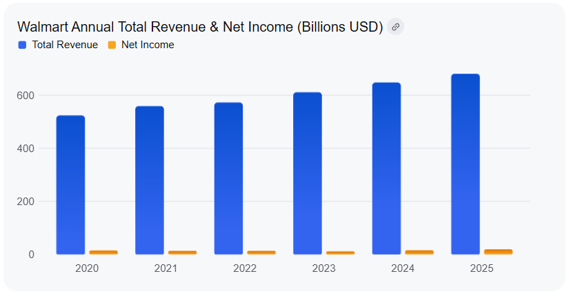 Τον Φεβρουάριο του 2026, η Walmart έγινε επίσημα ο πρώτος παραδοσιακός λιανοπωλητής που ξεπέρασε το 1 τρισεκατομμύριο δολάρια σε χρηματιστηριακή αξία, εισερχόμενος στην ελίτ των τεχνολογικών κολοσσών. Ωστόσο, τα πραγματικά οικονομικά μεγέθη και επιδόσεις, παρότι αυξανόμενα και μάλιστα σταθερά και πάνω από αντίστοιχες εταιρείες, δεν ακολουθούν τους ίδιους εκρηκτικούς ρυθμούς. Αλλά αυτές οι επιδόσεις δεν φαίνεται να επηρεάζουν αρνητικά την εικόνα της εταιρείας στους επενδυτές, μάλλον το αντίθετο….