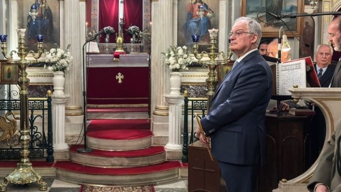 Πηγή Εικόνας: ΑΠΕ-ΜΠΕ/ΓΡΑΦΕΙΟ ΤΥΠΟΥ ΠΡΟΕΔΡΙΑΣ/STRΟ Πρόεδρος της Δημοκρατίας Κωνσταντίνος Τασούλας συνοδευόμενος από τη σύζυγό του Φανή Σταθοπούλου και την κόρη τους Μάγδα, παρακολούθησε την Ακολουθία της Αναστάσεως στον Ι. Ν. Αγίου Ιωάννη Ποσειδωνίας Σύρου.